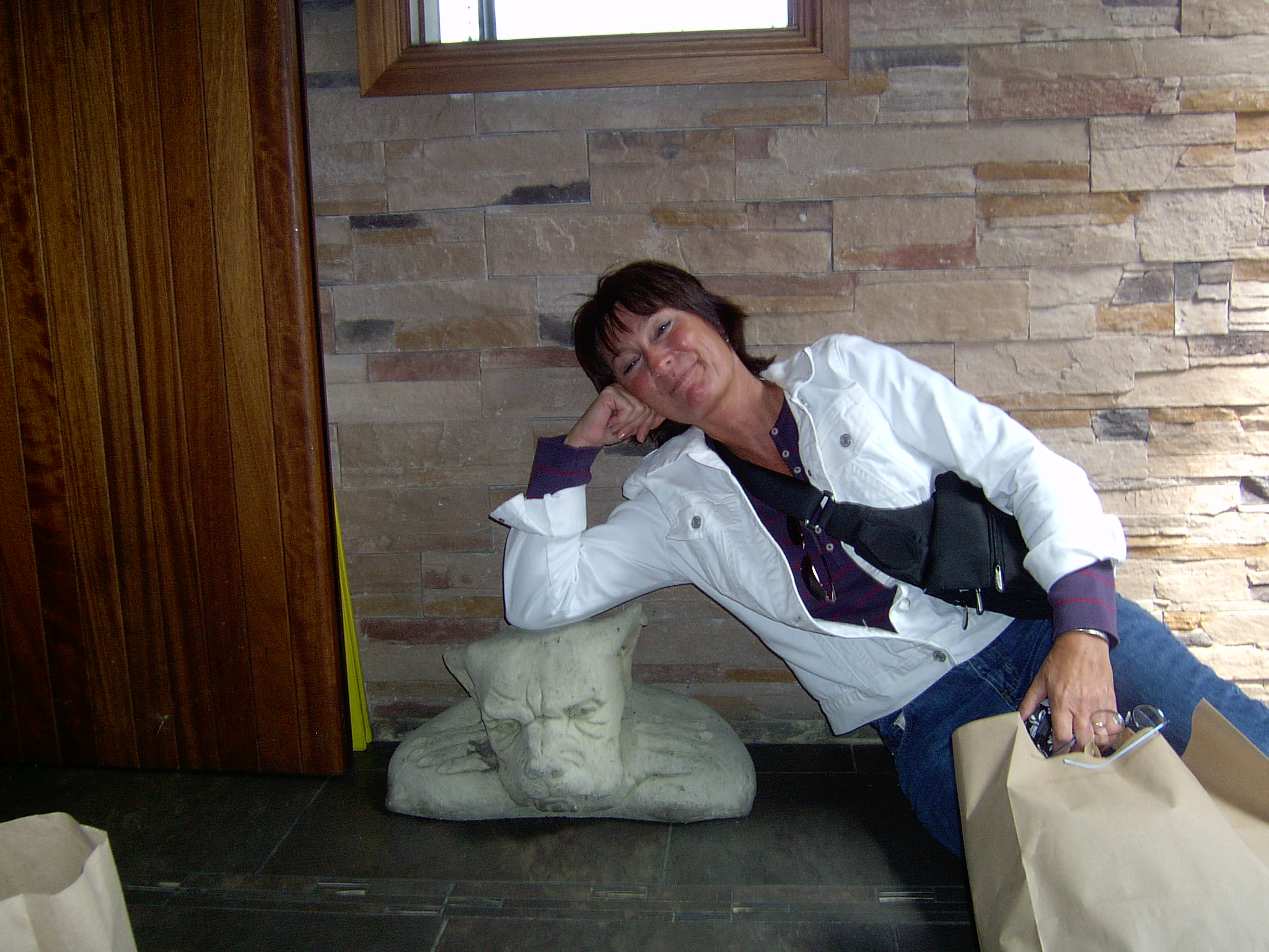 A batch of low black clouds blew in from the northwest. As the rain started to fall, slow at first and then with more insistence, we ducked into a bistro called Vista where we were graced with an upstairs harbor view of the squall. There was red pepper soup, Balmer’s Cider, and caramel cake. Some of the best seafood chowder ever ladled up. The sun came out just as we were handed our check. Standing guard at the bottom of the stairs was a life-sized concrete gargoyle bust, half-dog, half man-bat, all badass. Lorraine sat with him and almost got him to smile.